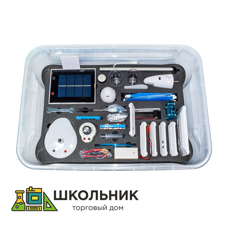 Комплект предназначен для проведения демонстрационных и лабораторных опытов по изучению возобновляемых источников энергии на уроках физики, естествознания, географии и экологии, а также для использования в проектной деятельности учащихся. Набор обеспечивает выполнение 9 базовых экспериментов.