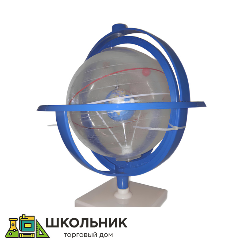 Модель небесной сферы разборная (можно извлечь сферу) изготовлена из пластмассы и металла, установлена на подставку, высота модели ≈ 300мм. Модель изображает небесную сферу (диаметр сферы ≈ 175мм.), на которую спроецированы небесные тела (звезды и созвездия). В центре небесной сферы помещена модель Земли. На оси вращения, которая пересекает поверхность Земли и сферы, ось Земли совпадает с осью мира. Для наземного наблюдателя вращение небесной сферы воспроизводит суточное движение светил на небе. Красная линия внутри сферы, Эклиптика — воображаемая линия (большой круг небесной сферы), по которой Солнце в течение года перемещается среди звезд. Модель небесной сферы можно вращать вокруг оси, угол наклона оси изменяется, сверху модели расположен компас. Вращение небесной сферы повторяет вращение небесного свода. Небесная сфера служит для изучения видимых положений и движений небесных тел. Для этого на ее поверхности фиксируются основные линии и точки, по отношению к которым и производятся соответствующие измерения.